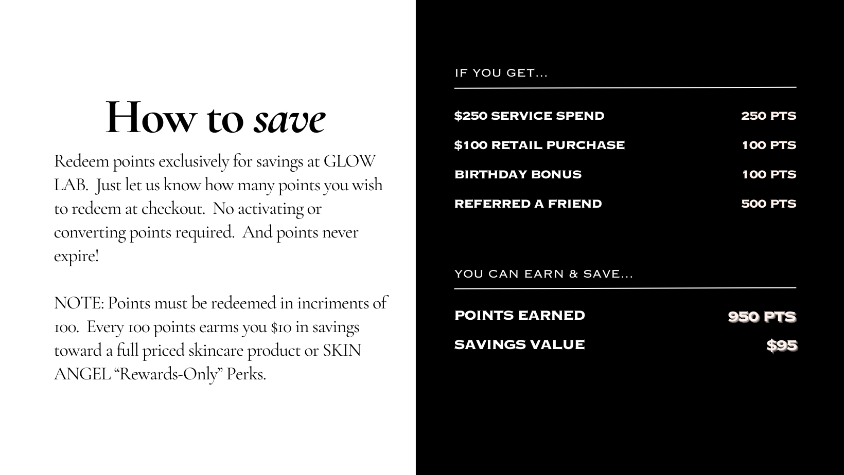 Earn points and perks on Glow Lab’s preferred skincare brand partners, as well as treatments and more. You become a part of our SKIN ANGEL Society automatically upon your first facial or tanning service. You’ll earn points according to the tables shown below. When you’re ready to use your points, just let us know you’re a SKIN ANGEL and we’ll redeem them from your SKIN ANGEL Wallet. Every 100 points earns you $10 in savings toward future full-priced products or “Rewards-Only” Society perks.